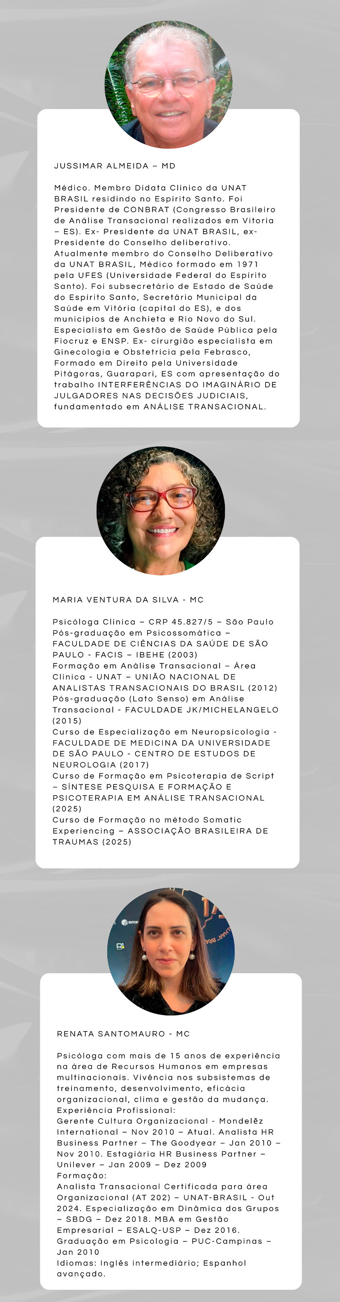 A Análise Transacional me ensinou sobre Autonomia emocional — a minha e a dos meus pacientes. Me ajudou a compreender os Estados de Ego, sua formação na infância e a influência do ambiente familiar nesse processo. Aprendi a reconhecer comportamentos automáticos que, muitas vezes, repetimos sem consciência, e o mais bonito: descobri que é possível criar novas formas de se relacionar, de se comunicar, de existir no mundo.